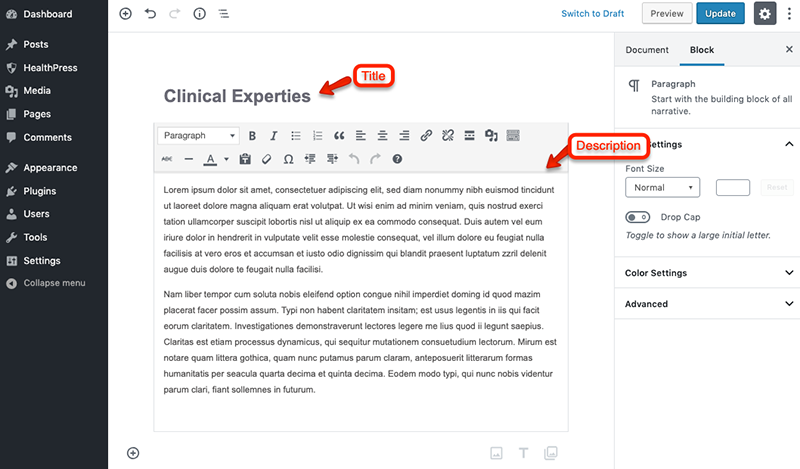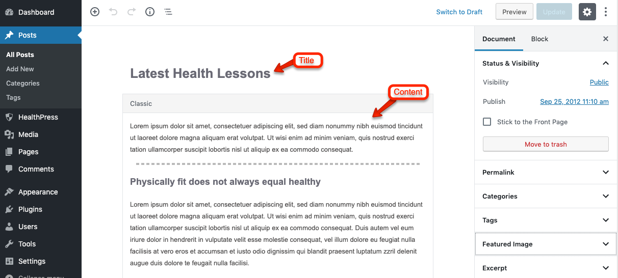 Go to WordPress Admin > Posts > Add New- Provide the post title and contents