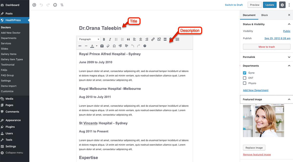 Navigate to Appearance > Customize > Home - Doctors, you can configure following things from there.