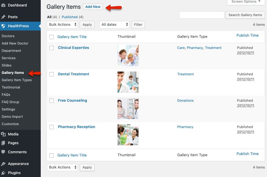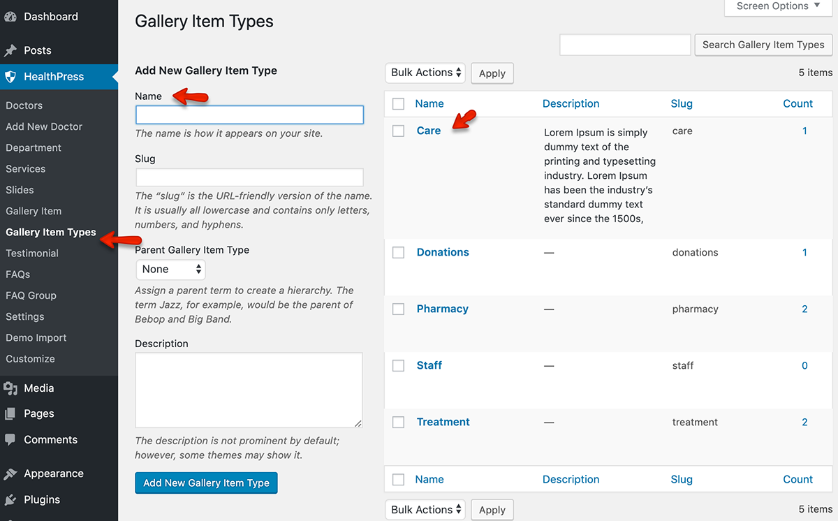 To Add Gallery Item Types go to HealthPress > Gallery Item Types