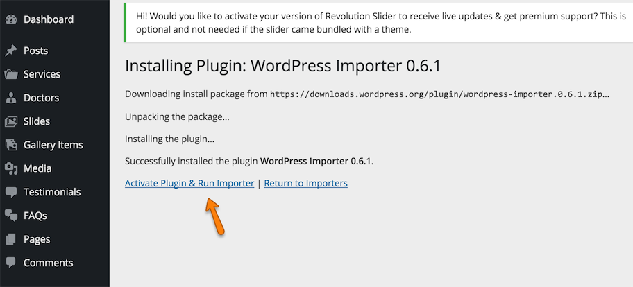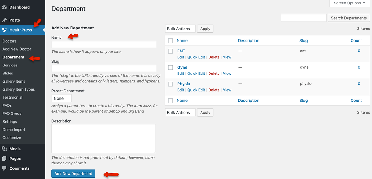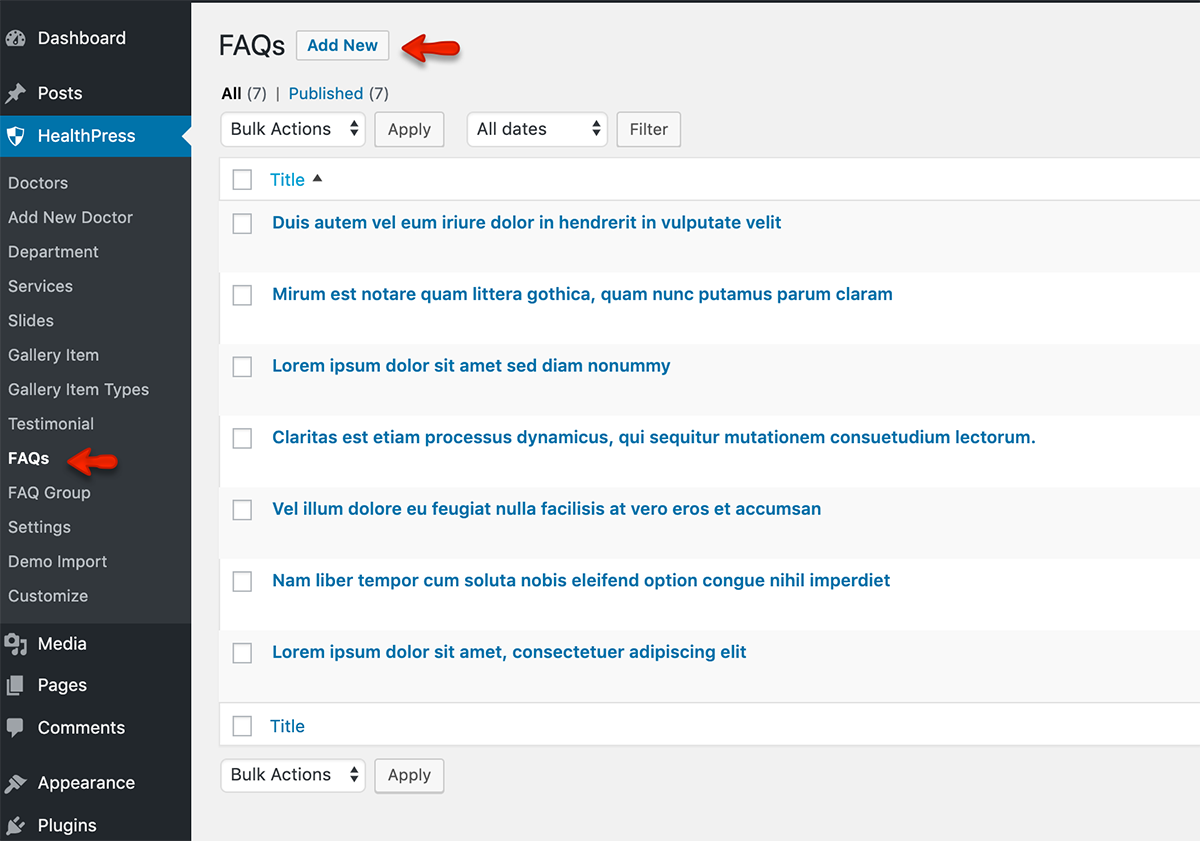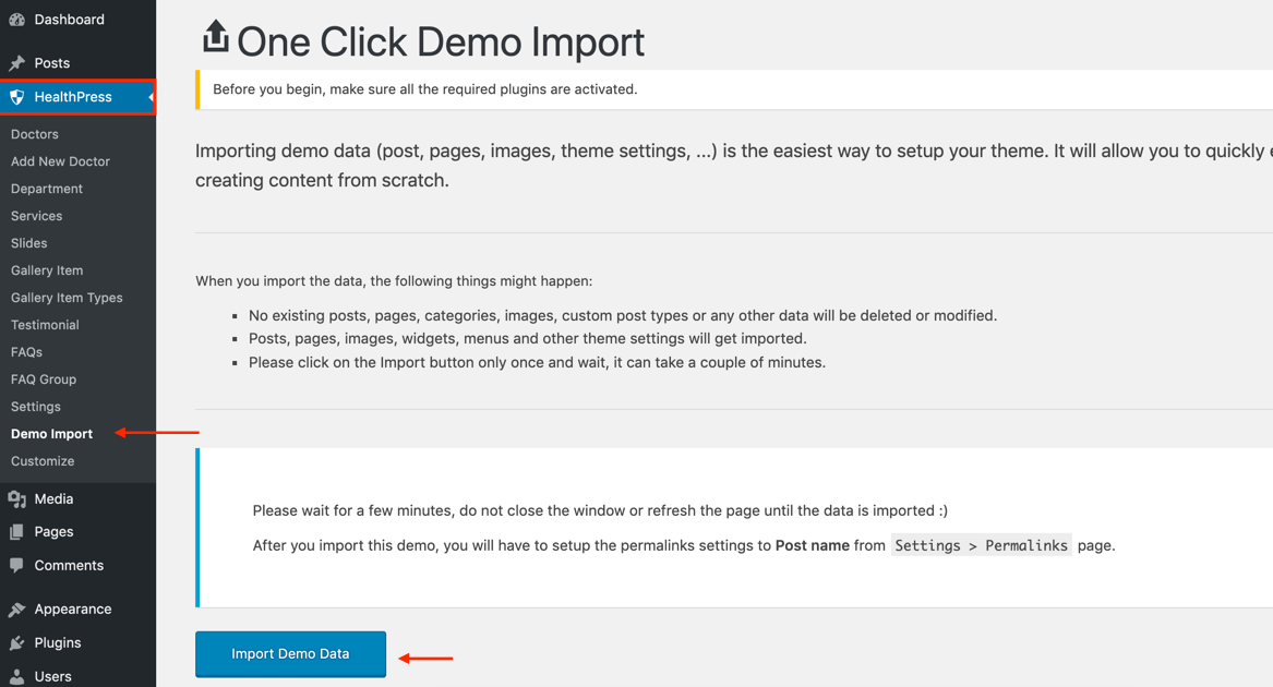 Go to HealthPress > Demo Import and click on it. Wait for few minutes as the demo images are being fetched from remote server and this process can take few minutes.