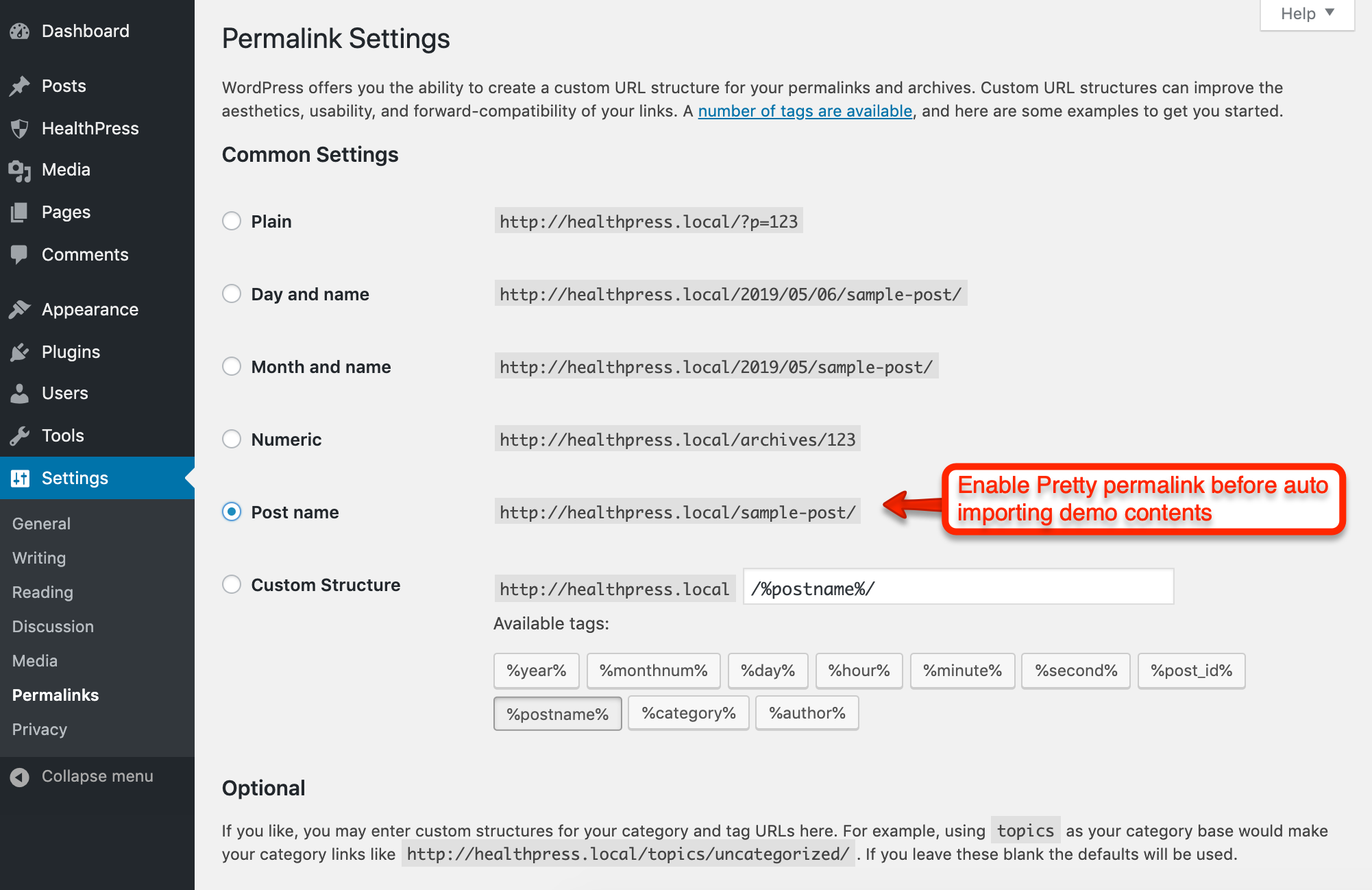 Note: It is important to complete Step 1 as import script is programmed to work with pretty permalinks. Otherwise you will have configuration issues after importing demo data contents.