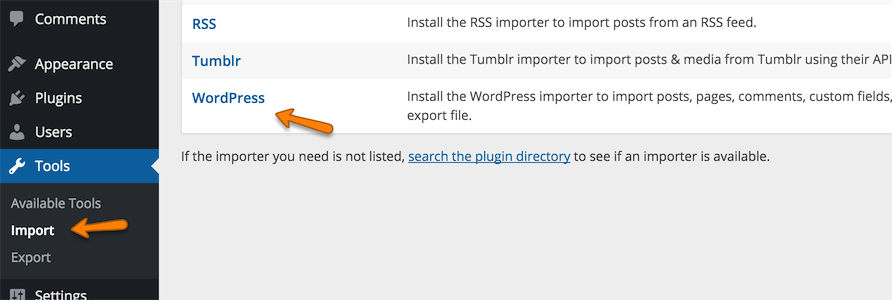 Go to WordPress Admin > Tools > Import and click WordPress as displayed in image below.
