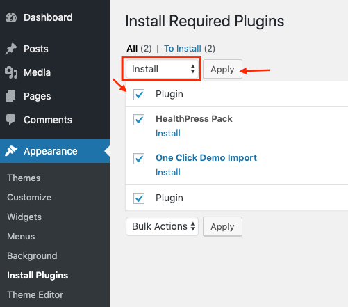 - On next page you will see the list of plugins to install. Select all the plugins and click on Install and then click on Apply to install all of them at once (as shown in the screenshot below).