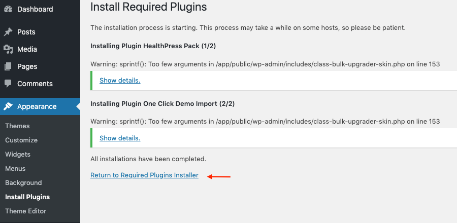- After all the plugins are installed click on Return to Required Plugins Installer.