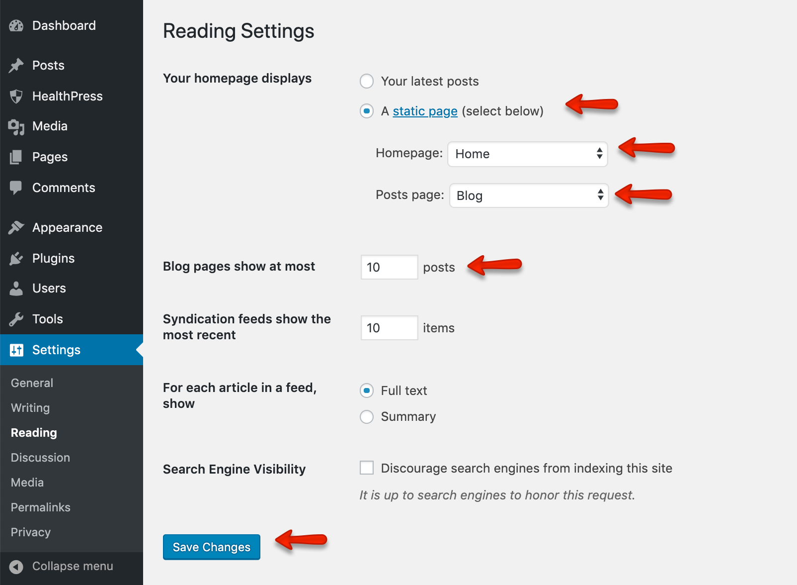 In case you followed Demo Contents Import, The reading settings should already be configured and you do not need to follow this section.