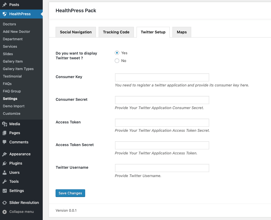 Navigate to HealthPress > Settings > Twitter Setup, and enter information.